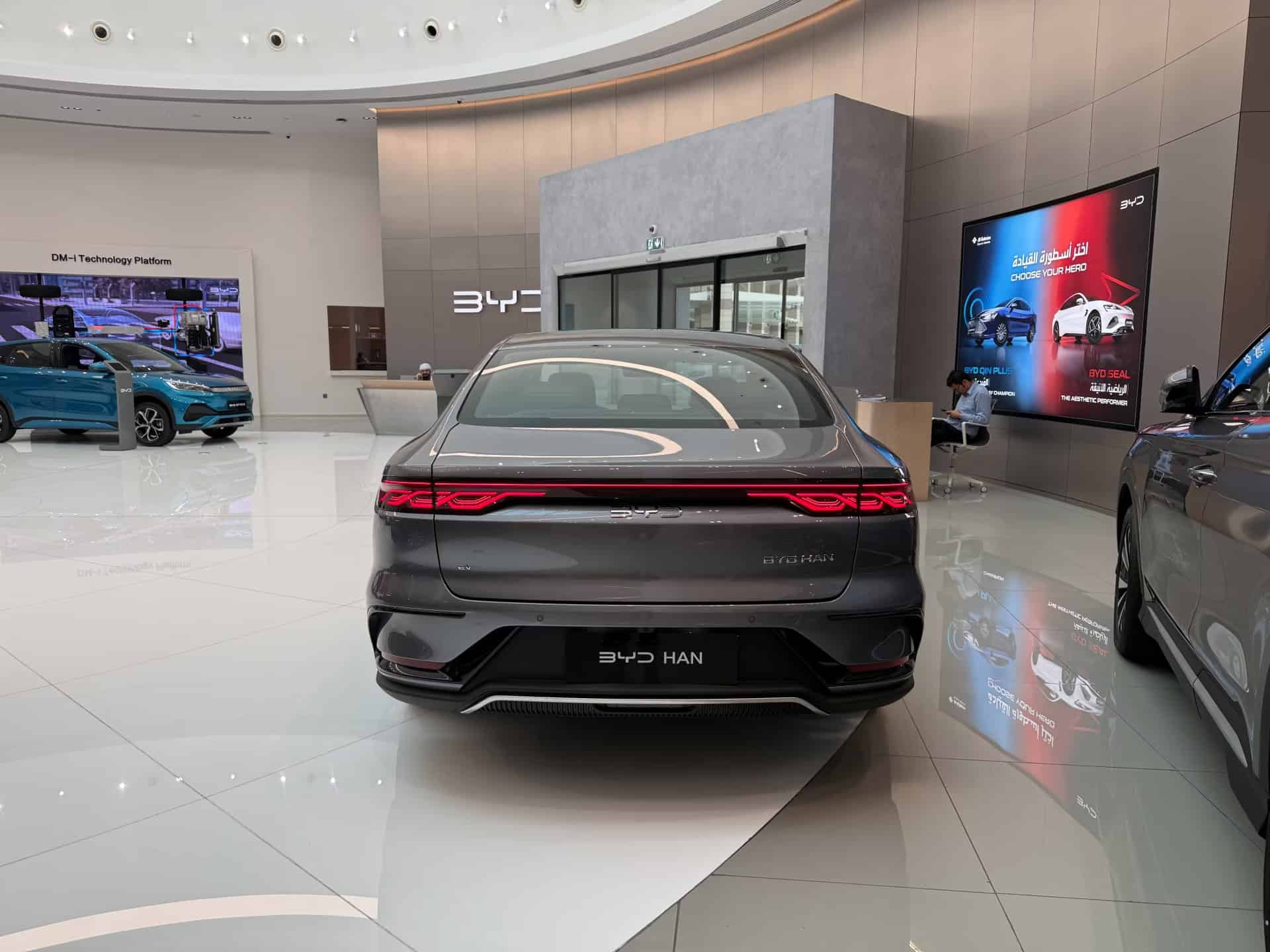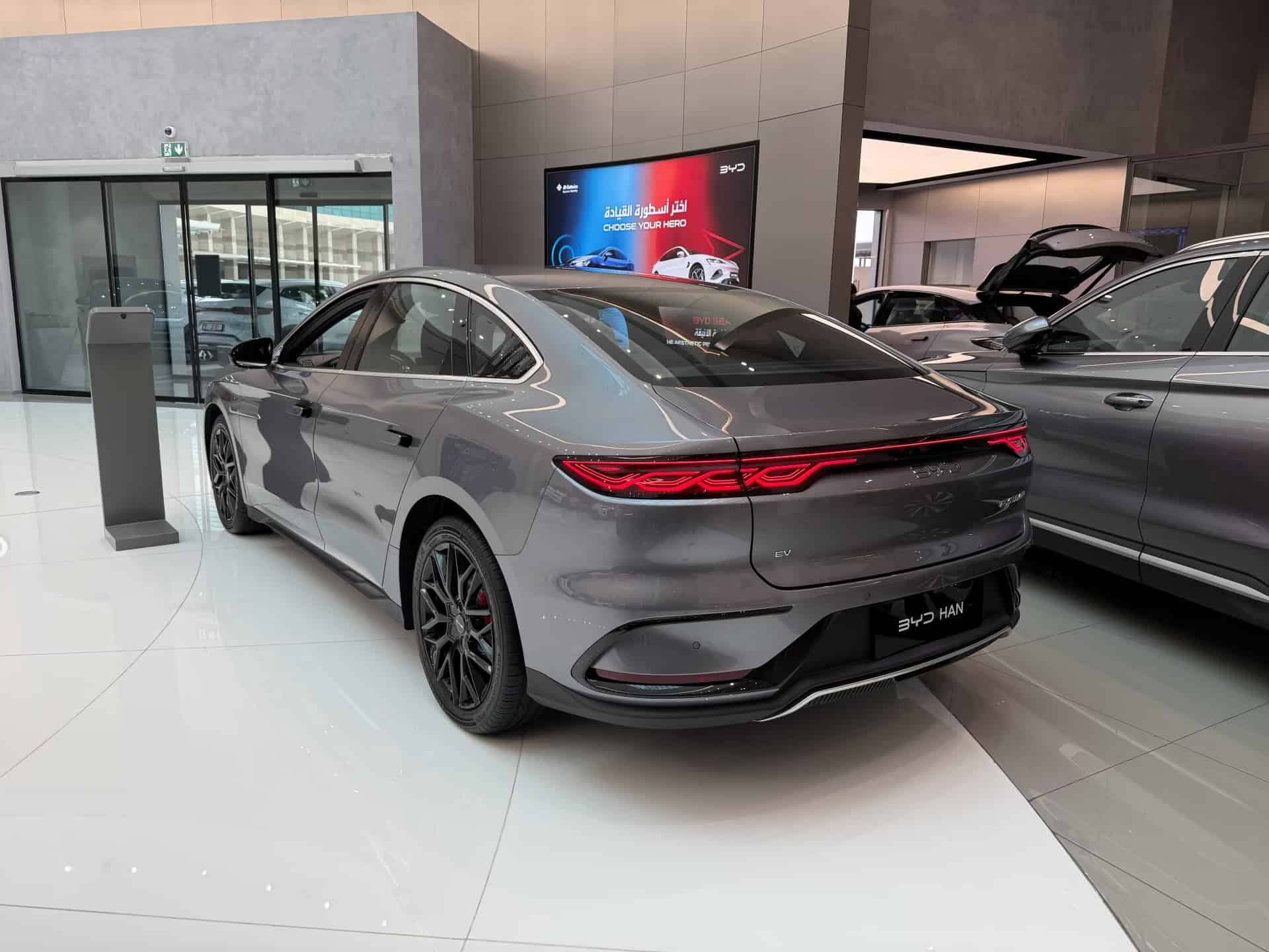 Phần đuôi xe của BYD Han được thiết kế theo cấu trúc đa tầng, tạo chiều sâu và sự cân đối. Cụm đèn hậu LED thanh mảnh lấy cảm hứng từ nanh vuốt sư tử đặt ngược, kết hợp với dải LED nối liền hai bên, mang lại vẻ sang trọng và hiện đại. Cốp sau được vuốt cong như cánh gió tích hợp, vừa tăng tính thẩm mỹ vừa cải thiện hiệu suất khí động học. Khu vực biển số kích thước lớn cùng đèn phản quang hai bên giúp hoàn thiện vẻ ngoài đầy cuốn hút của BYD Han.