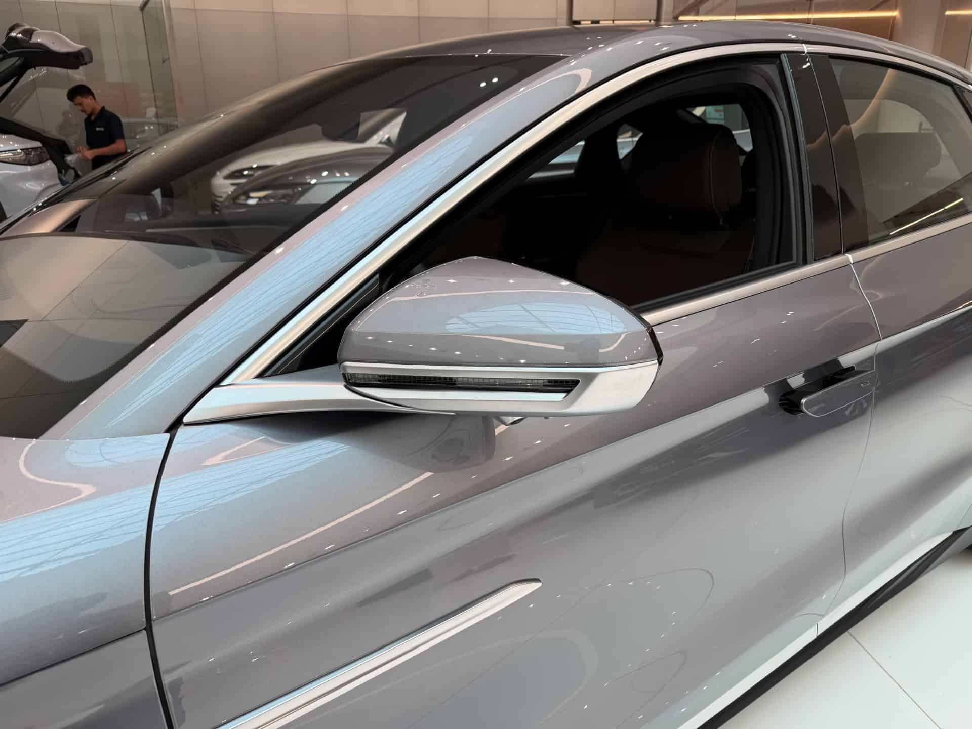 Gương chiếu hậu mỏng tích hợp đèn xi-nhan, cảnh báo điểm mù và chức năng sấy gương tiện lợi. Tay nắm cửa dạng ẩn giúp giảm lực cản gió và mang lại vẻ ngoài gọn gàng, tinh tế cho chiếc sedan điện này.