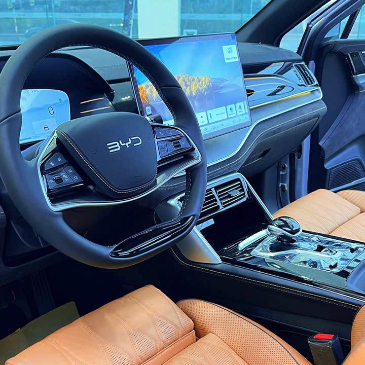 BYD sử dụng da Nappa Full Grain xử lý bằng công nghệ Aniline, không chứa chrome để thân thiện với da nhạy cảm. Các chi tiết ốp Aluminum Brushed Dark phủ nano chống vân tay, kết hợp gỗ Walnut tái chế từ rừng trồng.